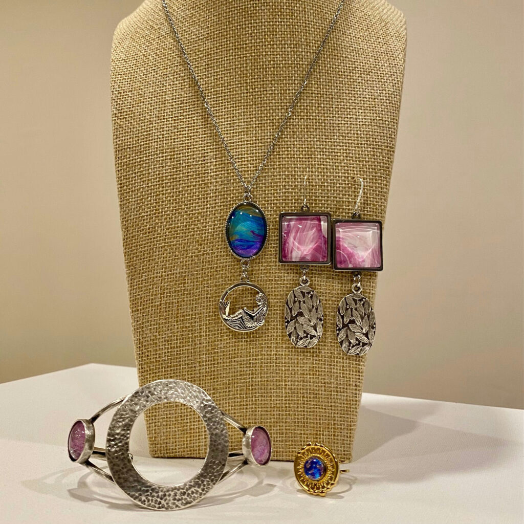Nancy Liner started creating acrylic fluid art in 2022. Self-taught, she really enjoys mixing paints/colors in such a way to allow the paint to move and flow across the canvas to create a design. While the colors used may be similar, every creation is unique. Additionally, her passion is creating jewelry from acrylic paint. Nancy makes earrings, rings, bracelets, and necklaces and it brings great pleasure to select the correct setting and charm for each piece. Her latest medium is alcohol inks, she really enjoy the process of creating with inks. The merging colors create a unique and colorful pattern.